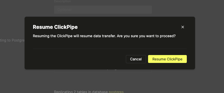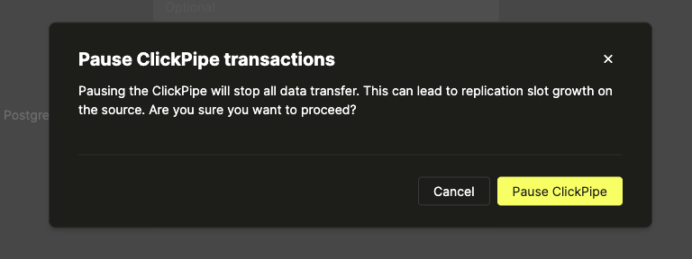 В некоторых сценариях может быть полезно приостановить Postgres ClickPipe. Например, вы можете захотеть выполнить анализ существующих данных в неизменном состоянии. Или же вы можете проводить обновление Postgres. Ниже описано, как приостановить и возобновить Postgres ClickPipe.