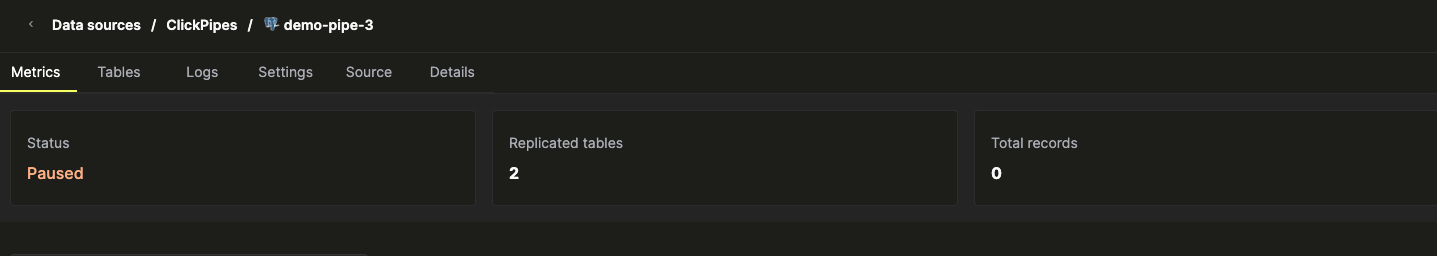 - На вкладке Data Sources нажмите на Postgres ClickPipe, работу которого вы хотите возобновить. Статус зеркала изначально должен быть Paused.